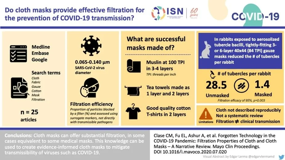 Forgotten technology in the COVID-19 pandemic: Filtration Properties of Cloth and Cloth Masks - A Narrative Review. Clase CM, Fu EL, Ashur A, Beale RCL, Clase IA, Dolovich MB, Jardine MJ, Joseph M, Kansiime G, Mann JFE, Pecoits-Filho R, Winkelmayer WC, Carrero JJ. Mayo Clin Proc 2020:95;2204-2224.